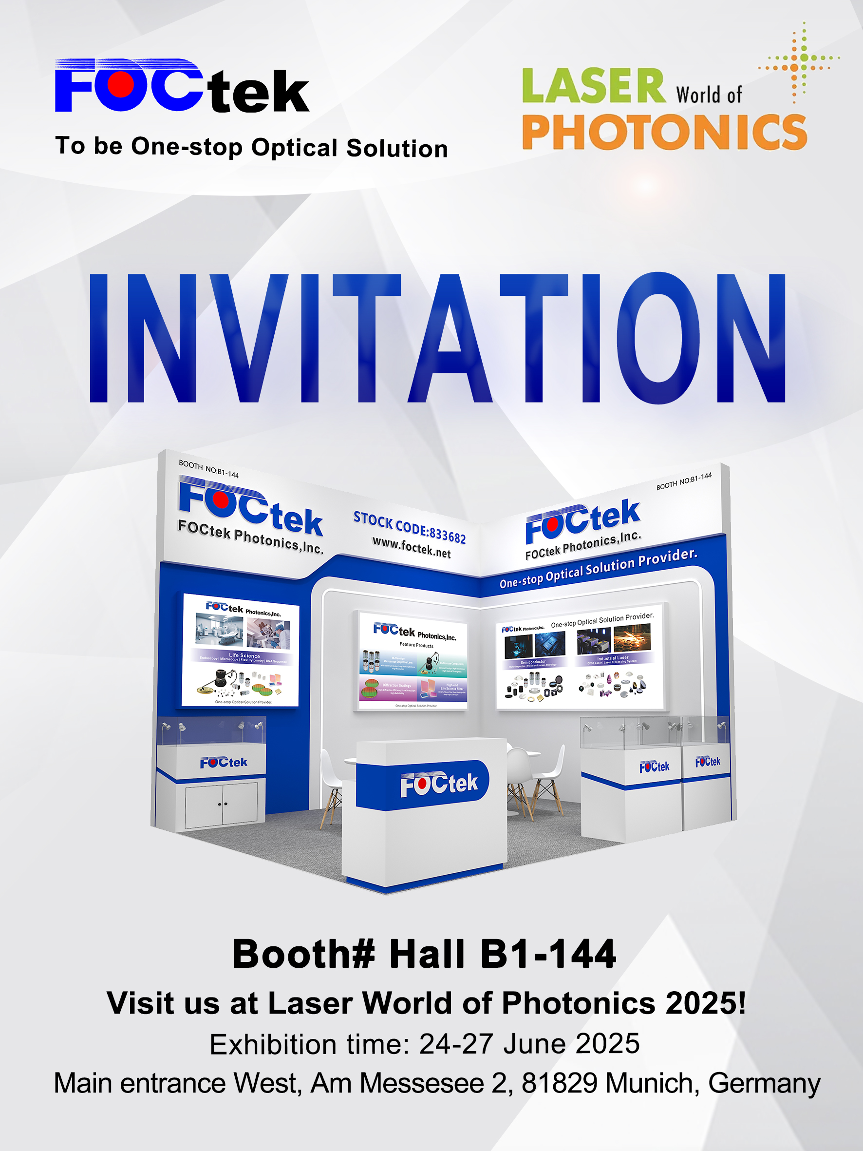 福特科将于2025年6月24-27日期间,参加在德国慕尼黑新国际博览中心举行的德国慕尼黑激光及光电展览会,展出生物医疗光学、半导体光学、工业激光光学等领域的光学解决方案。